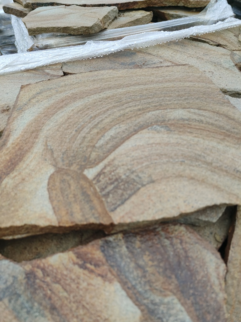 Песчаник жёлтый с разводами - для работ по мощению дорожек и площадок на бетонное основание.